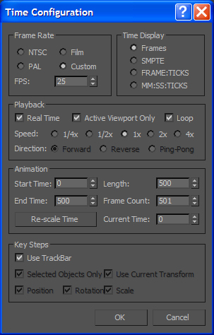 Si seleccionamos el botón Time configuration (Configuración de tiempo) nos aparecerá el cuadro de arriba. En él marcaremos la opción Custom y marcaremos 25 FPS cantidad suficiente y generalmente usada de frames por segundo para una visualización correcta de la imagen. En el cuadro Playback dejamos marcado Real Time. En Animation, en la casilla lenght , colocamos 500, que serán los frames reflejados en nuestra línea de tiempo, si dividimos 500 frames entre 25 (frames por segundo)