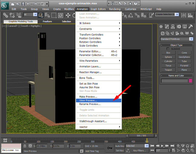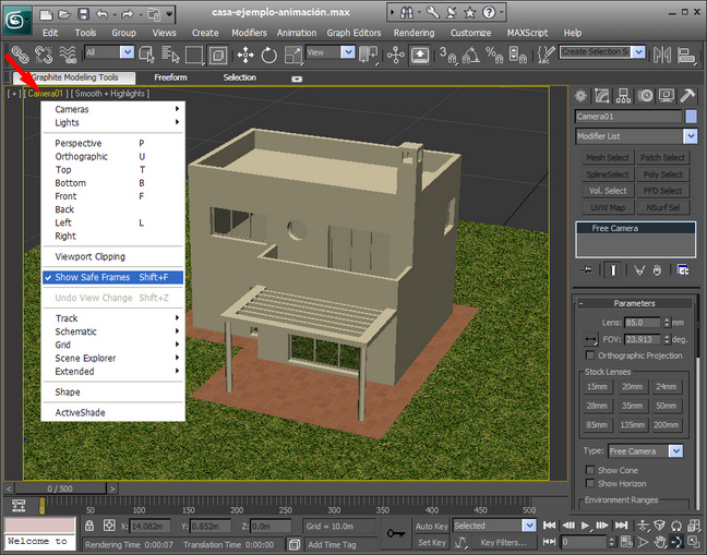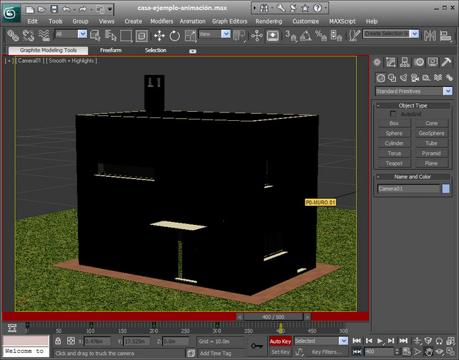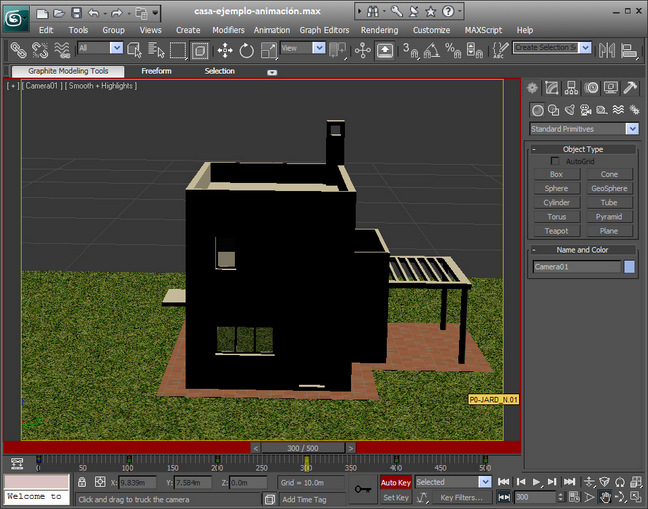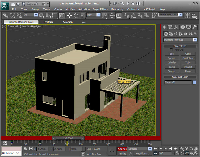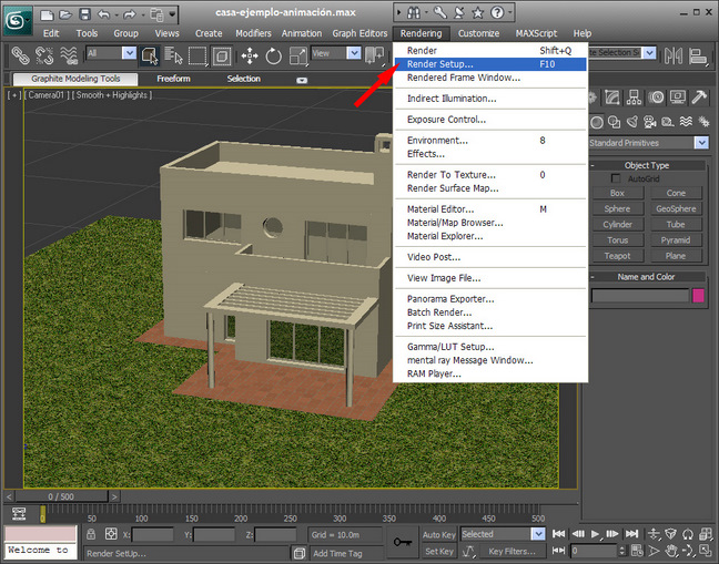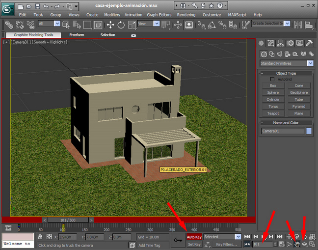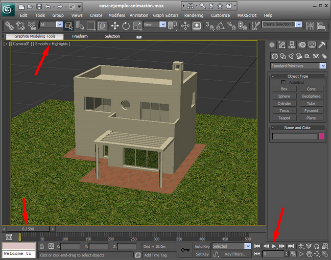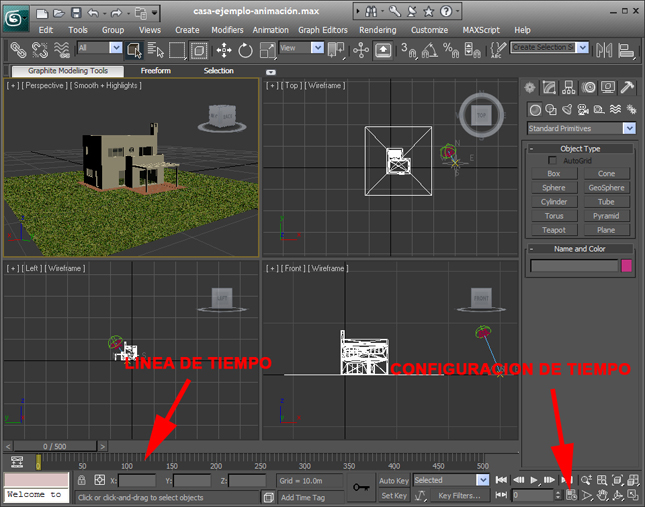 Empezamos iniciando nuestro programa 3dsmax10 y abrimos el archivo que tenemos preparado y que hemos nombrado casa-ejemplo-animación.max. Primero explicaremos los comandos que usaremos para empezar a realizar nuestro proyecto.