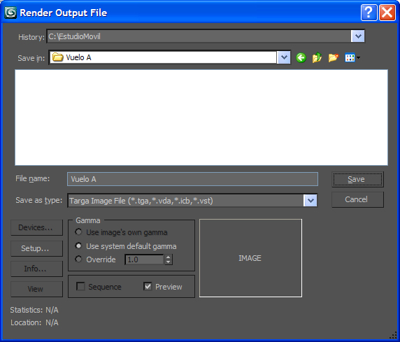 En el botón files más abajo, marcamos la opción de archivo con formato TGA a 32 bits y en el cuadro emergente creamos una carpeta que llamaremos Vuelo A, donde se alojarán cada uno de los cuadros que vallamos creando, y en el campo nombre de archivo (file name) también le llamaremos Vuelo A.
