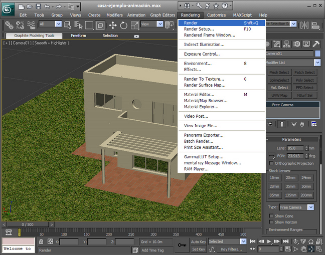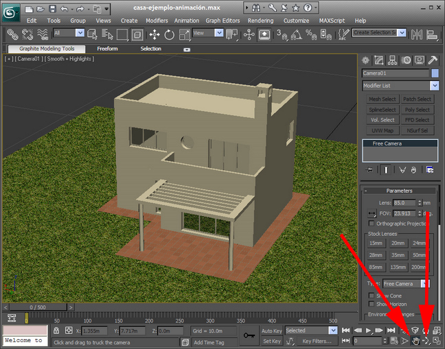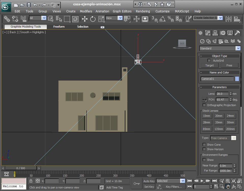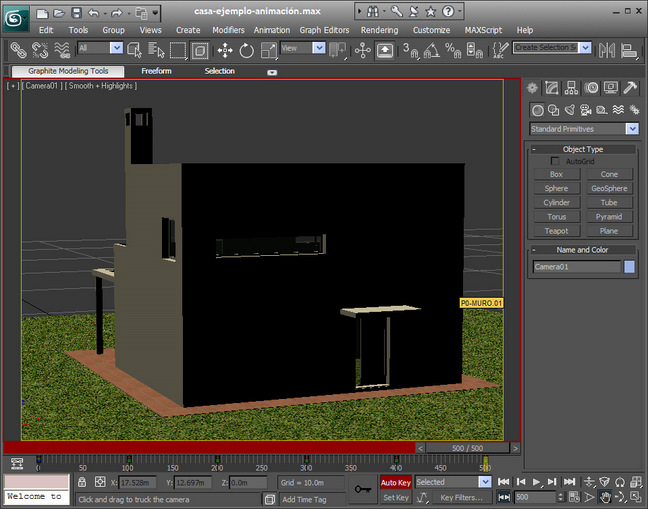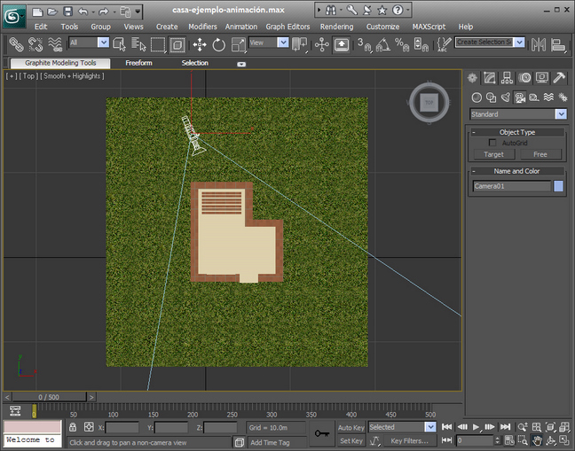 hemos situado la cámara. Como vamos a hacer un recorrido de 500 frames