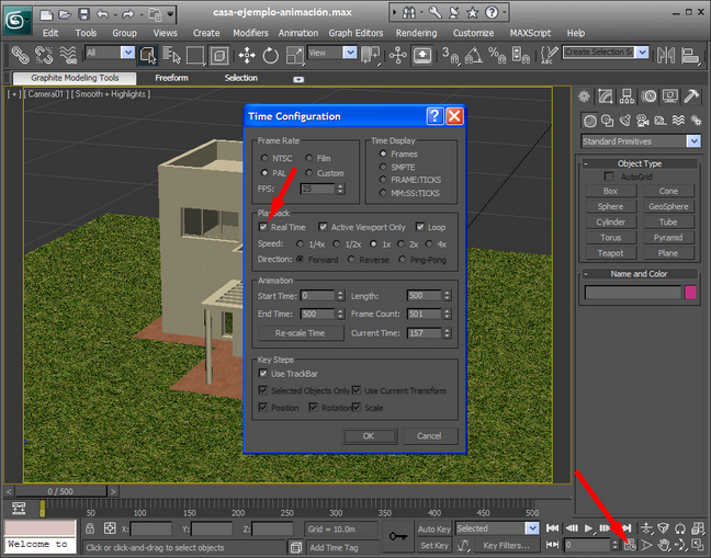 También es importante tener marcado en el cuadro de configuración de tiempo la opción Real time, pues así la animación aunque tenga saltos y tropiezos se reproducirá en el tiempo establecido.