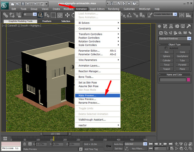 Si tenemos un ordenador poco potente tenemos otra opción de previsualización que es generando un archivo de tipo avi para luego reproducirlo como una película en el ordenador. Para ello vamos a la pestaña animación (animation) y seleccionamos make preview
