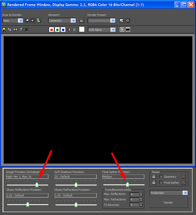 Realizados estos ajustes solo nos queda cambiar los parámetros de mental ray, para obtener unas imágenes de calidad, en la ventana rendered frame window de la pestaña rendering y los colocamos de la siguiente manera :
